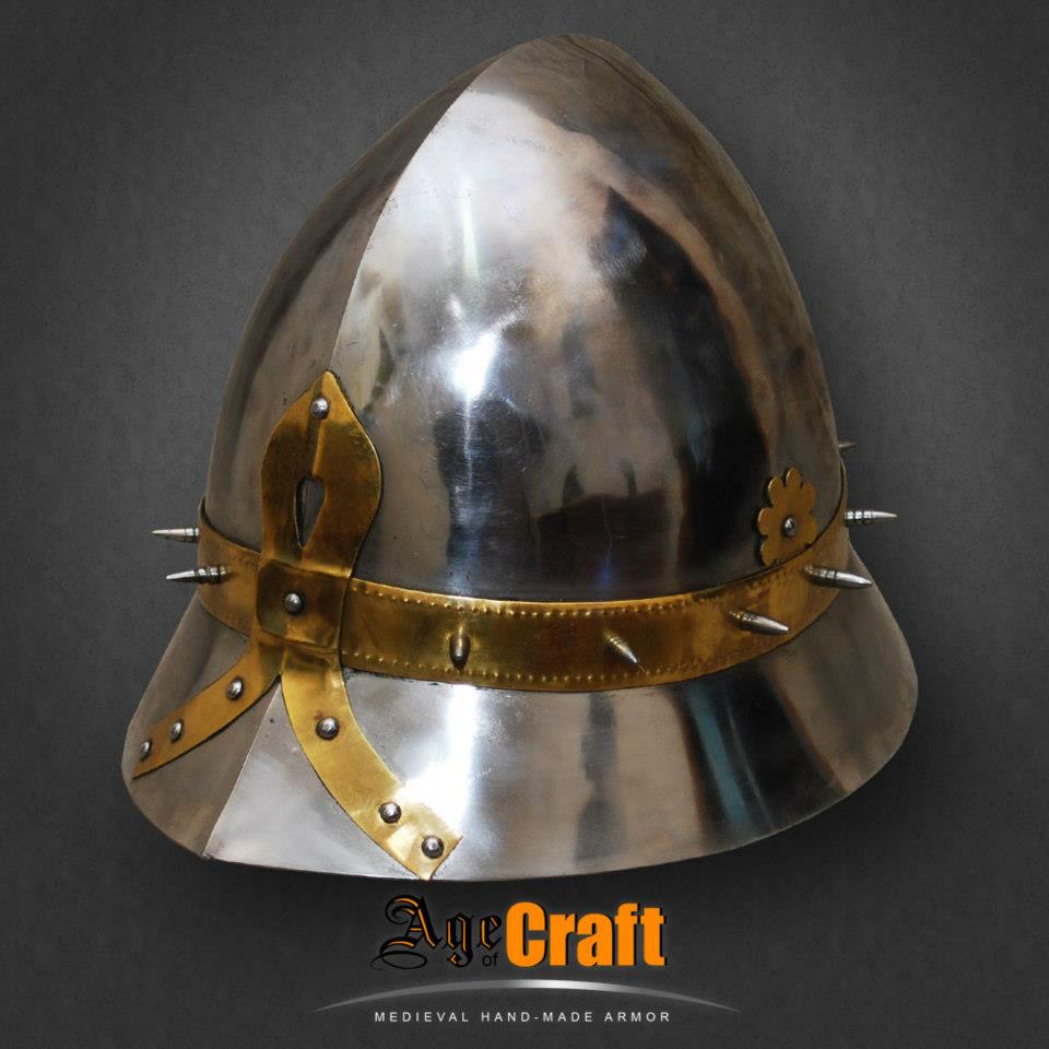 Очень изящный красивый и пропорциональный шлем для пехотинца, который кое чего добился в своей военной карьере. Кроме безукоризненой формы идеально приспособленой для отражения ударов (рациональный наклон частей тульи и полей) он украшен латунными накладками с чеканкой и шипами. Английские названия подобных шлемов вполне соответствуют его форме Кеттльхельм (kettle helmet) переводится как шляпа-шлем, а ироничное Kettle hat как шляпа чайник.