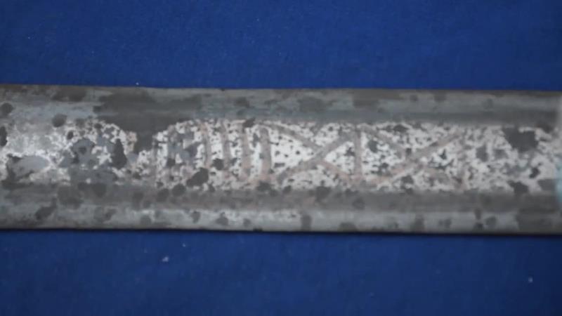 И тут началось самое интересное. Занимался последней шлифовкой и доводкой клинка,так ничего на нём и не обнаружив интересного кроме крестообразных насечек на шариках гарды,как супруга проходила мимо и говорит что на клинке видит иксы. Думали глюк. Ан,нет - под определённым углом освещения увидели иксы и поперечные риски. Совсем непонятно стало как это может быть. Перевернули клинок другой стороной,и под тем же углом увидели и ахнули надпись. На фото очень тяжело передать видимое под углом,но кажется всё же видно. Поднял книгу Кирпичникова и просто прозрели. Цитата – «Удивительное обилие надписей и знаков, проступивших вдруг на вещах, давно и хорошо известных, объясняется производственными особенностями клеймения. Это звучит почти неправдоподобно, но волшебное свойство мет заключается в том, что в зависимости от сохранности и ухода они могут то исчезать, то появляться вновь. Надписи и знаки на изделиях IX-XIII веков располагались в верхней трети клинка, они были инкрустированы в горячем состоянии железной или дамаскированной проволокой. Даже на полосе, очищенной от коррозии, начертания почти неразличимы».